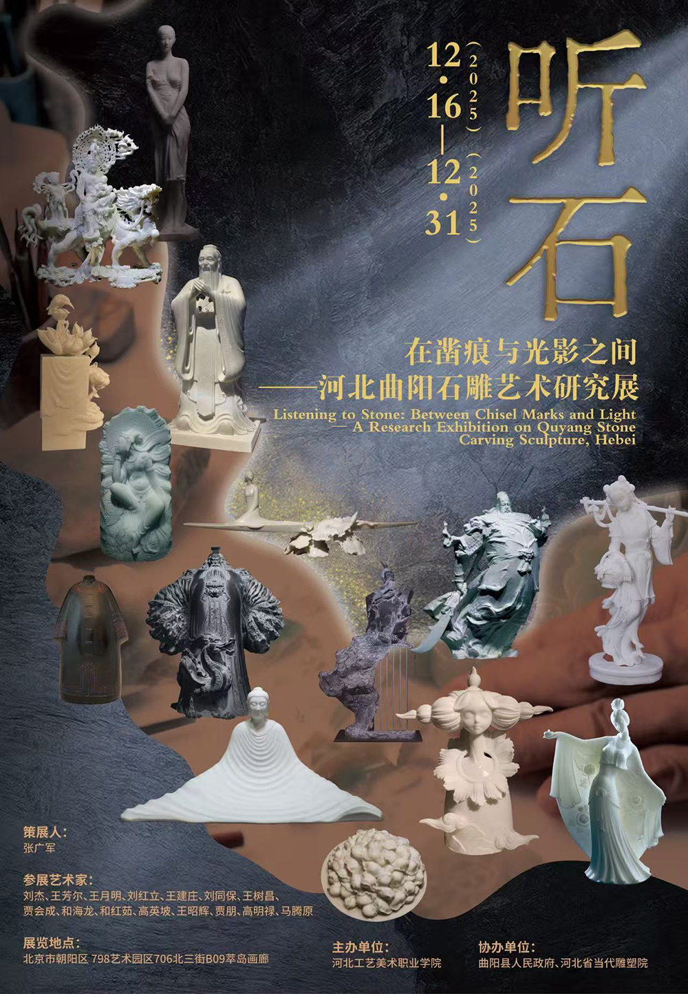 由河北工艺美术职业学院策划并主办、我校校长张广军担任策展人,曲阳县人民政府和河北省当代雕塑院协办的“听石:在凿痕与光影之间——河北曲阳石雕艺术研究展”,将于2025年12月16日至31日在北京798艺术区萃岛画廊举办。