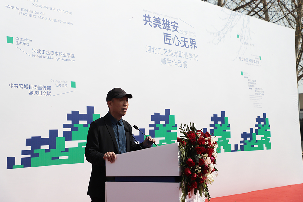 张广军在致辞中指出,本次展览是学院举办的第四届“共美雄安”主题展,正值习近平总书记2026年3月23日亲临雄安考察,主持召开深入推进雄安新区高质量建设和发展座谈会,并强调要牢牢把握雄安新区作为北京非首都功能疏解集中承载地的首要功能定位的关键时期,意义重大。学院始终将“共美雄安”系列展览作为深度链接新区文化生态、服务区域发展的重要平台,持续整合多方资源,通过系统梳理地域文化、推动文创转化,努力将雄安的文化特质转化为可感知、可传播的美学成果。他号召全体师生与工艺美术工作者,不仅要“来到雄安”,更要深度“融入雄安、建设雄安”,以更具规模、更富建设性的艺术实践,回应国家建设文化强国的目标,真正为新时代创新高地和高质量发展样板注入深厚的文化动能。