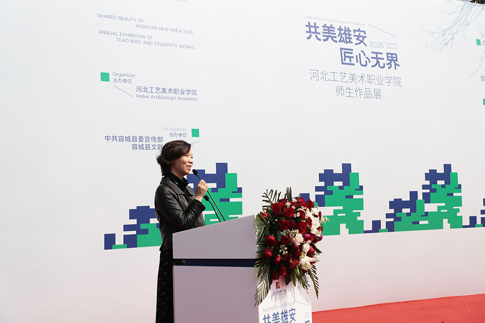 河北省美术家协会副主席、保定市文联主席、河北大学艺术学院副院长李文岗,以及容城县委宣传部部长陈丽分别对展览的成功举办表示祝贺并致辞。两位嘉宾从学术高度与实践维度,一致肯定了本次展览对服务雄安新区发展、探索美育社会服务新模式的重要意义。展览既集中展现了河北工艺美术职业学院的教学创作实力,又以校地合作为纽带,将工美艺术融入雄安新区文化建设与城市美学营造,是艺术高职院校服务国家重大战略、助力区域文化繁荣的生动实践。