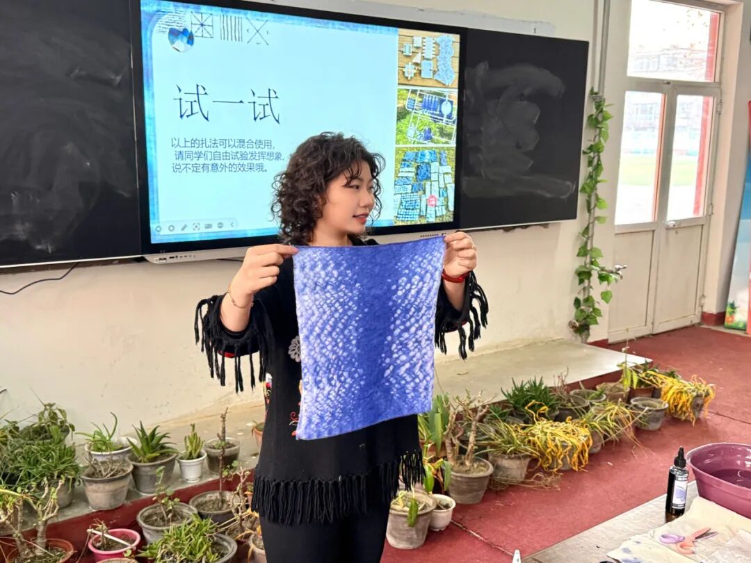 在详细讲解“夹染法”和“捆扎法”两种基本技法后,张老师进行了扎染方巾的现场示范。通过折叠、夹固、捆扎、浸染等步骤,引导同学们观察色彩的变化与纹样的生成。