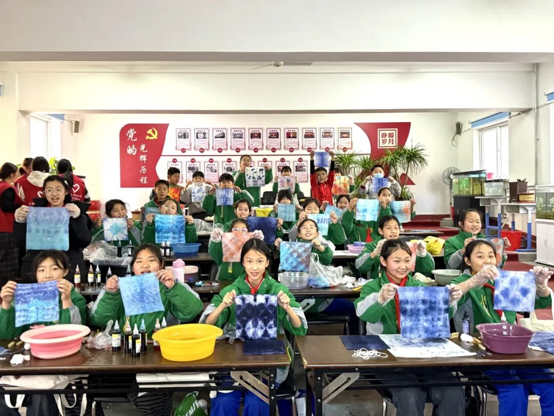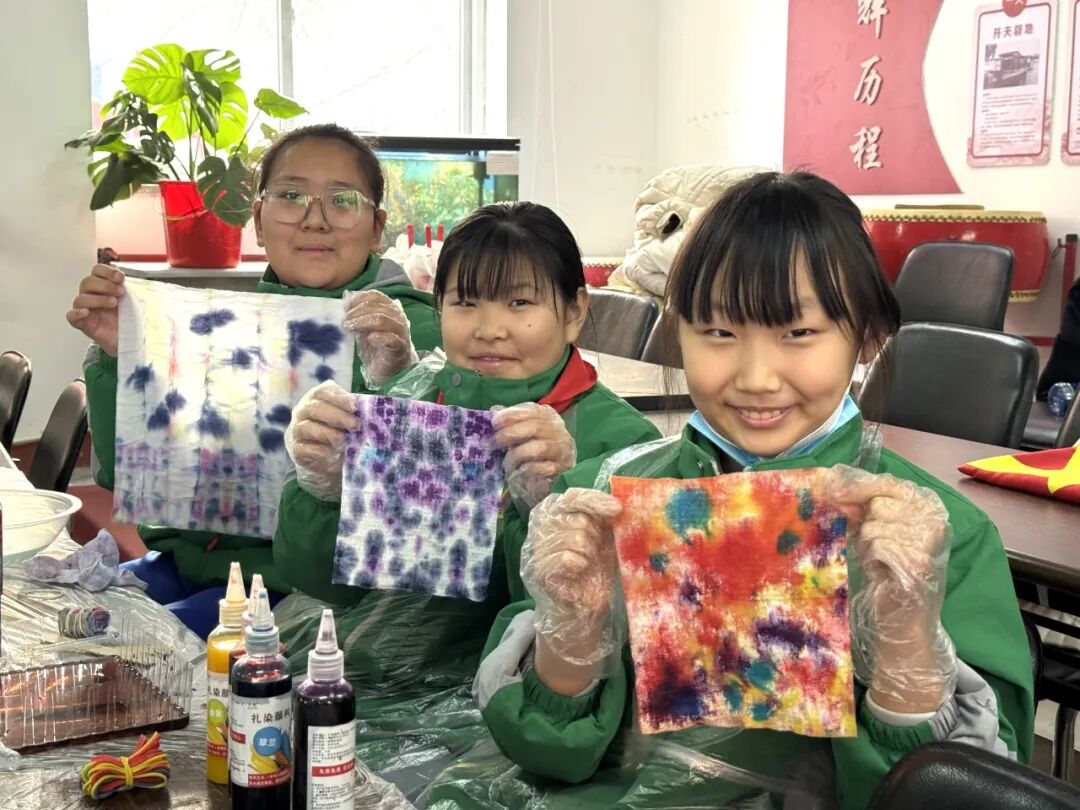 本次活动由支部教师张雅迪、张彭云、杨彤旭带领学生志愿者共同组织,面向实验小学五年级学生,通过讲解、示范与实践相结合的方式,带领孩子们领略扎染技艺的千年魅力,体验手工创作的乐趣。