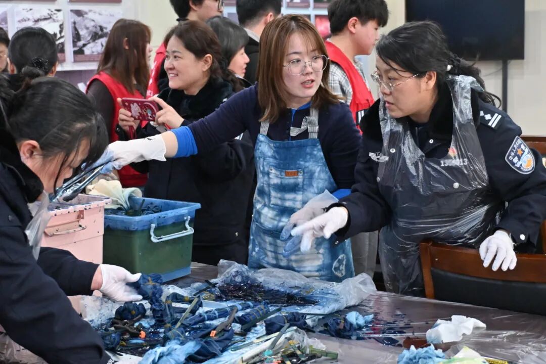 大家围坐一起,动手体验、交流创作,在色彩晕染间创作独一无二的作品,现场气氛温馨热烈。一扎一染,既是传统技艺的传承,也是匠心与温情的交融。通过非遗文化交流与暖心志愿服务,既丰富了女警官们的精神文化生活,也展现了我系青年学子服务社会、奉献爱心的责任与担当,让雷锋精神在艺术实践中焕发新的时代光彩。