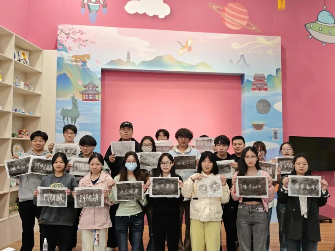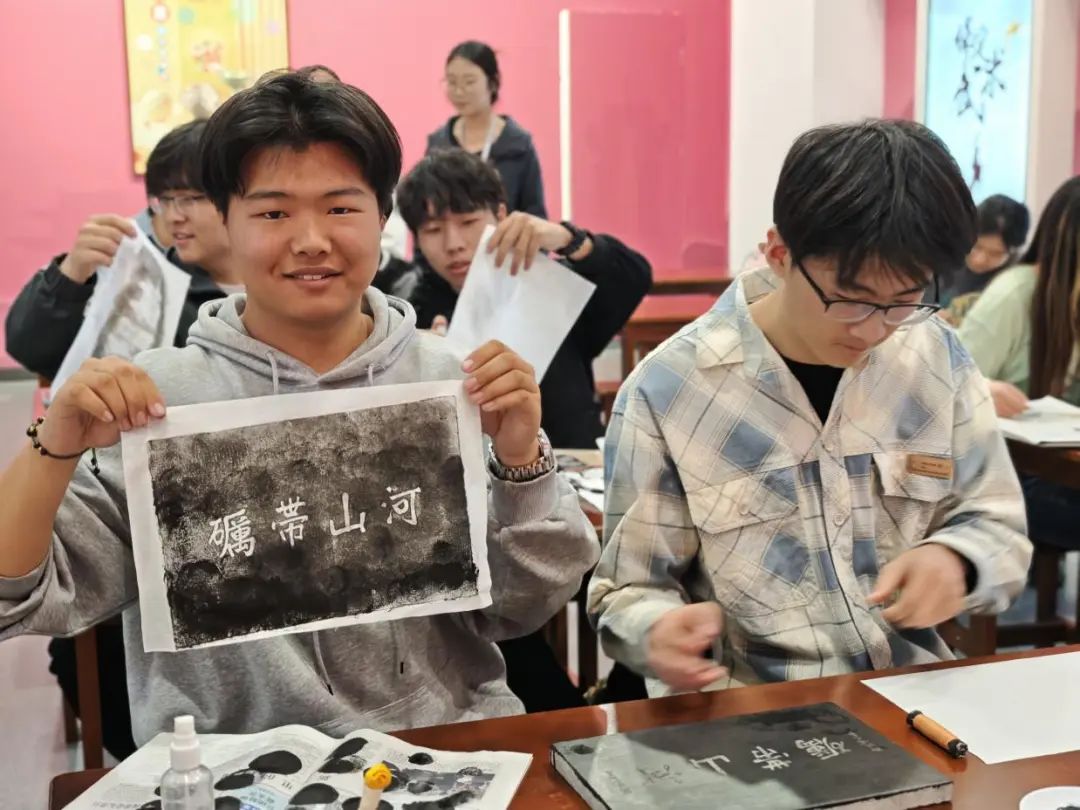 实践环节中,在老师的指导下,同学们手持棕刷、拓包、宣纸等传统工具,逐步解锁拓印技艺的实操步骤,最后通过轻重有序的拍打,让石碑上的文字图案在宣纸上徐徐显现。此刻,历史不再是展柜里冰冷的文物,而是通过指尖的触碰,在年轻的心跳里重新鲜活。